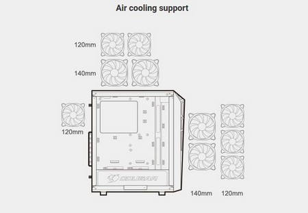 - спереду - 120 мм x 3 / 140 мм x 2 (120 мм x 2 Cougar Vortex LED попередньо встановлених)