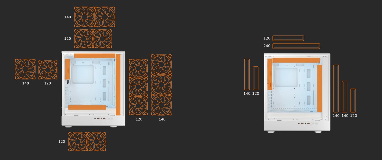 - Спереду: 240 мм / 140 мм / 120 мм (Радіатор встановлюється або спереду або зверху)