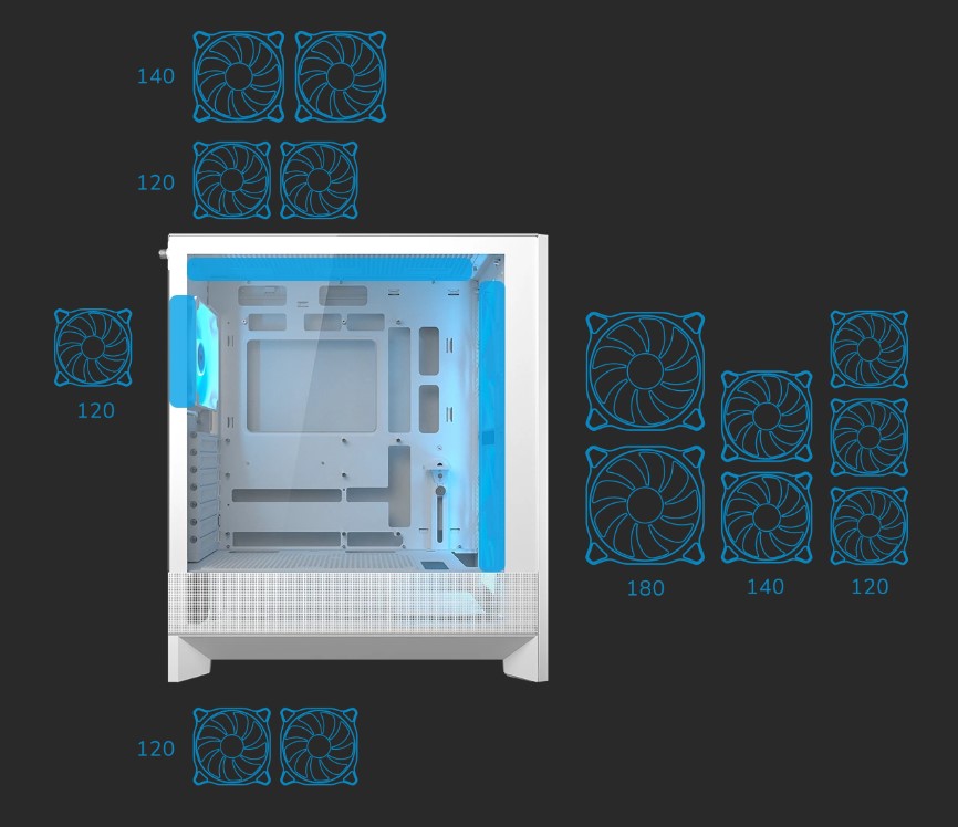 - Швидкість: 180-мм вентилятор ARGB PWM: 300-1200 ±10% об/хв, 120-мм вентилятор ARGB PWM: 1200 ±10% об/хв