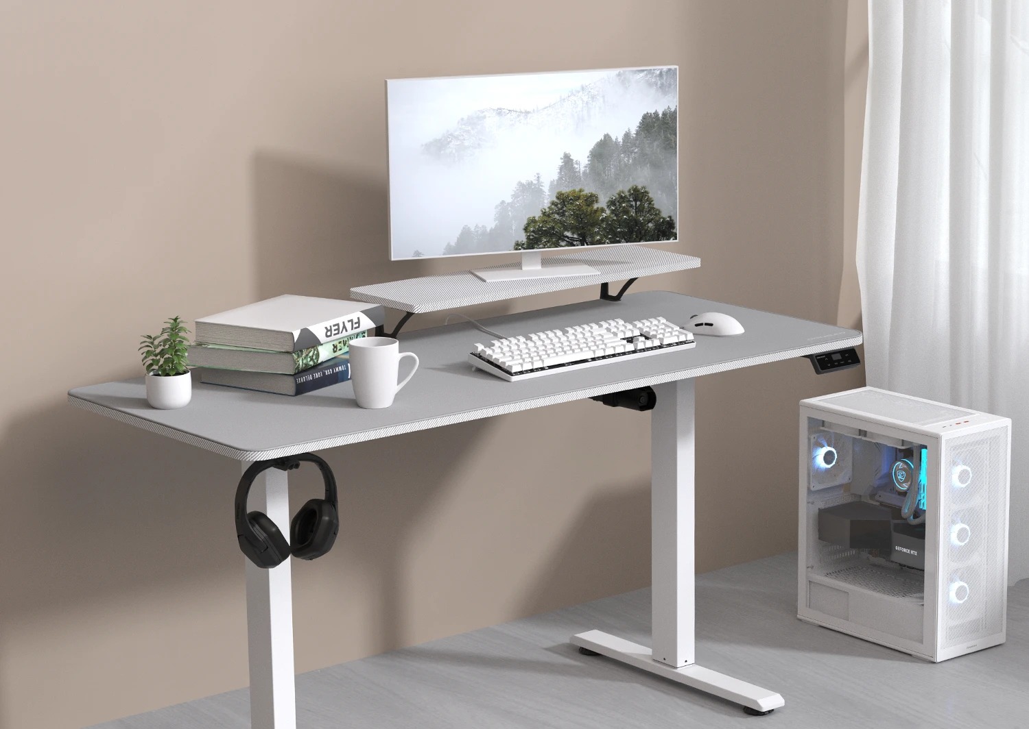 Вертикальність підставки для монітора максимально ефективно використовує функціональний простір, а лоток для прокладання кабелів і гачок для гарнітури звільняють стіл від безладу, максимально збільшуючи корисну площу.