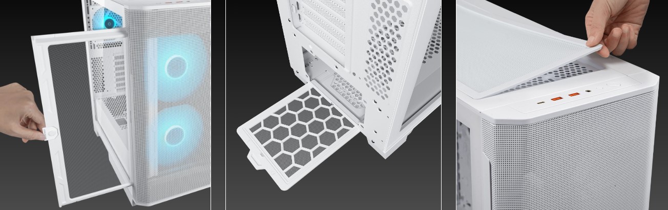Фільтри з трьох вентильованих сторін – спереду, зверху і знизу – ефективно запобігають потраплянню пилу, підтримуючи чистоту компонентів. Передній швидкознімний пиловий фільтр легко виймається без зняття передньої панелі, що спрощує обслуговування, а гумова накладка забезпечує більш надійний хват фільтра, що підвищує зручність використання. Верхній фільтр кріпиться магнітами, а нижній фільтр легко висувається.