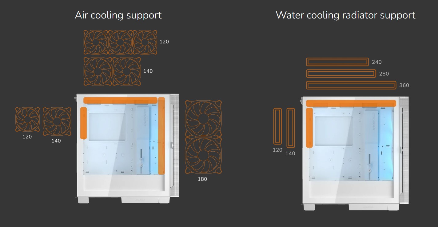 Підтримка радіатора AIO розміром до 360 мм або повітряного кулера висотою до 190 мм з можливістю розширення системи охолодження до 6 вентиляторів дозволяє вашій системі працювати максимально ефективно, коли гра стає спекотною.