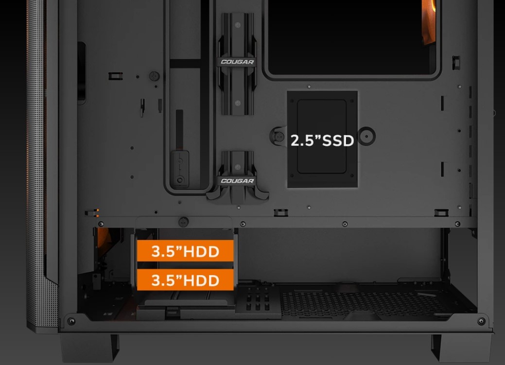 Airface Flo RGB вміщує до 1 твердотільного накопичувача розміром 2.5 дюйма і 2 жорстких диска розміром 3.5 дюйма.