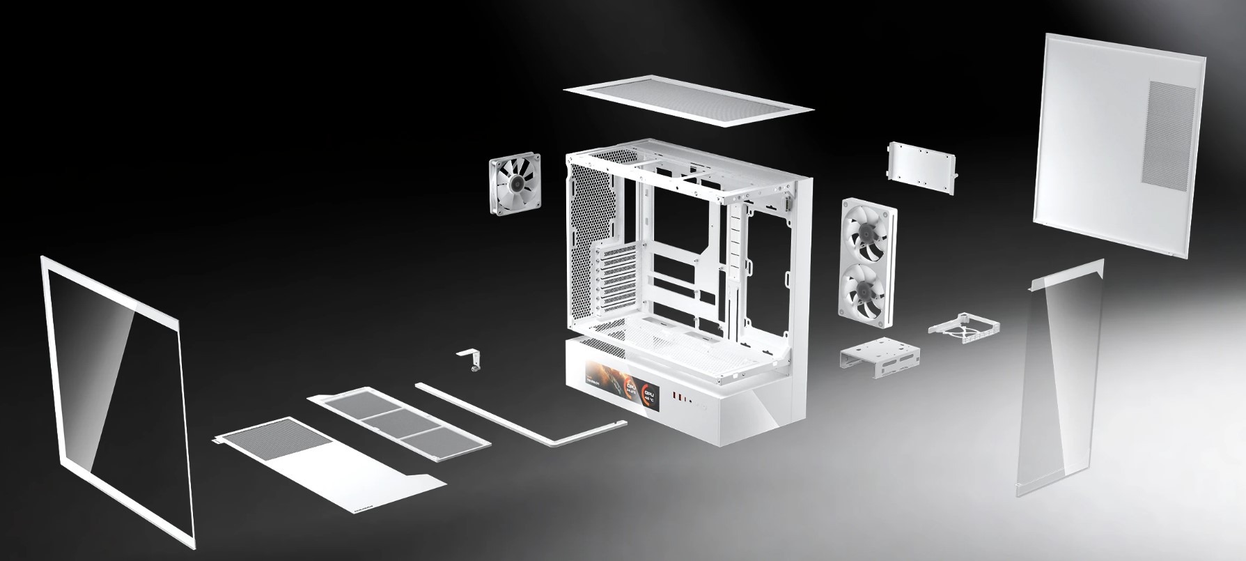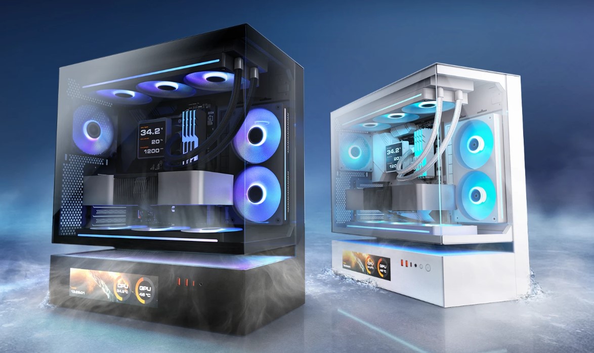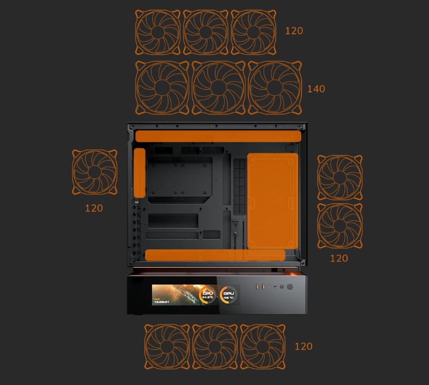 CFV235 Vision — це новий тип корпусу для ПК з інноваційною конструкцією центральної плаваючої вентиляції (CFV). Вона розділяє відсік блоку живлення та основний відсік, дозволяючи використовувати вільний простір між ними для охолодження та додаткової вентиляції. Вбудований 9.16-дюймовий IPS TFT LCD-дисплей забезпечує програмний моніторинг системи в режимі реального часу з роздільною здатністю 1920х462 і частотою оновлення 60 Гц, відображаючи критично важливі дані і настроювані візуальні ефекти.Оптимальне поєднання повного панорамного огляду, компактних розмірів, архітектурно вдосконаленої системи охолодження і технології відображення з ефектом присутності — CFV235 Vision дозволяє візуалізувати повітряний потік за межами звичайних обсягів.