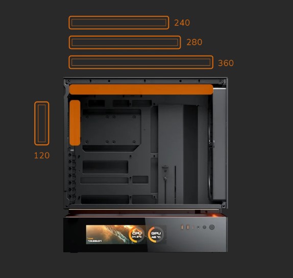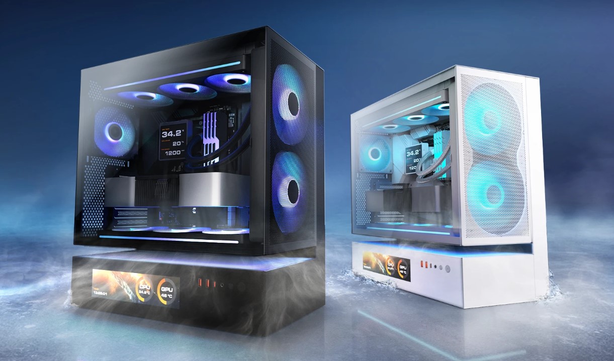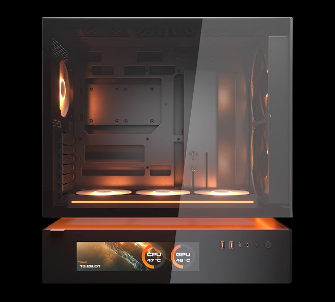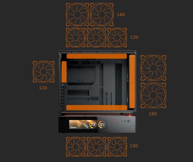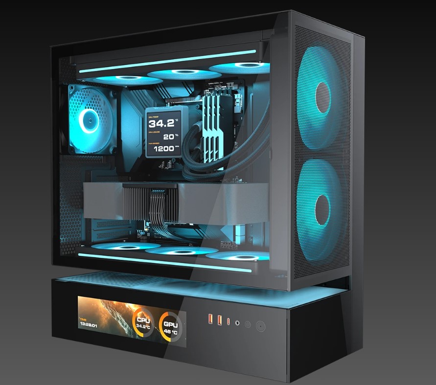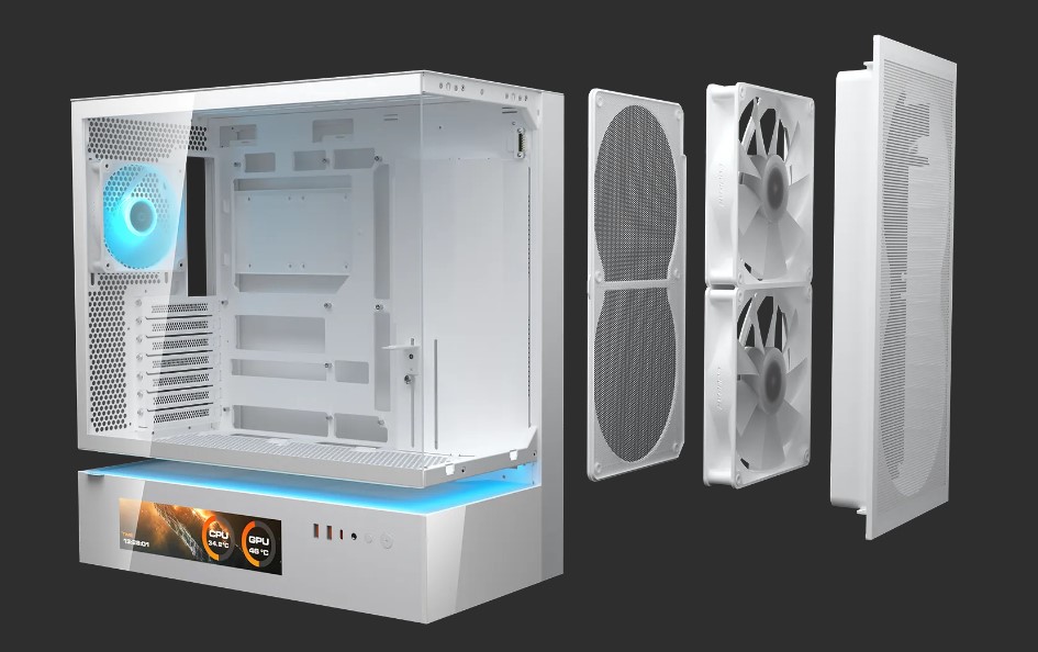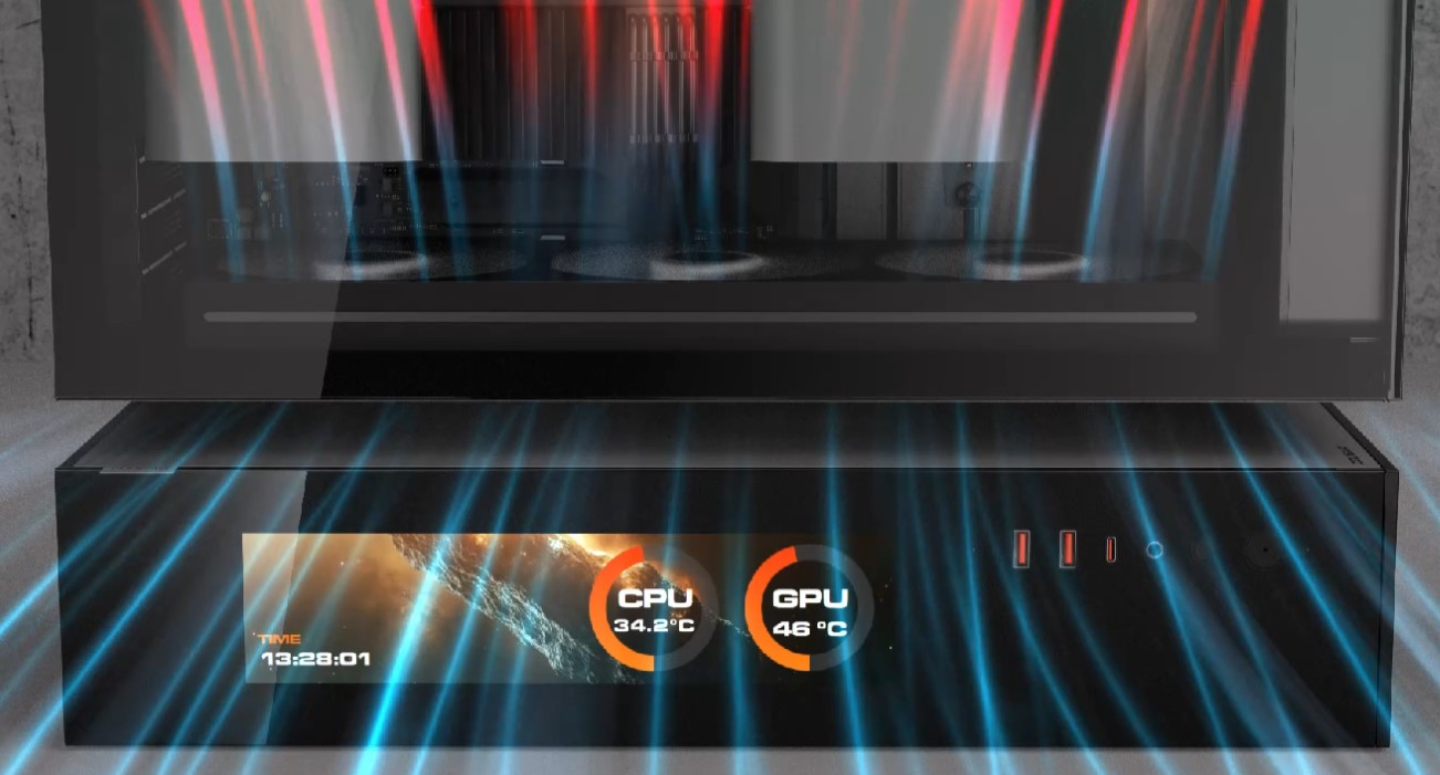 CFV235 Mesh Vision — це новий тип корпусу для ПК з інноваційною конструкцією центральної плаваючої вентиляції (CFV). Вона розділяє відсік блоку живлення і основний відсік, дозволяючи використовувати відкритий простір між ними для охолодження за рахунок додаткової вентиляції, зберігаючи компактність без шкоди для поліпшеного охолодження, закладеного в архітектуру. Вбудований 9.16-дюймовий IPS TFT LCD-дисплей забезпечує програмний моніторинг системи в режимі реального часу з роздільною здатністю 1920 x 462 і частотою оновлення 60 Гц, відображаючи критично важливі дані і настроювані візуальні ефекти.У поєднанні з модулем передньої панелі "3-в-1", що об'єднує сітку, два 160-міліметрові вентилятори ARGB PWM і пиловий фільтр в єдиний попередньо зібраний блок, а також технологією відображення з ефектом присутності, CFV235 Mesh Vision забезпечує візуалізований потік повітря за межами звичайних обсягів.