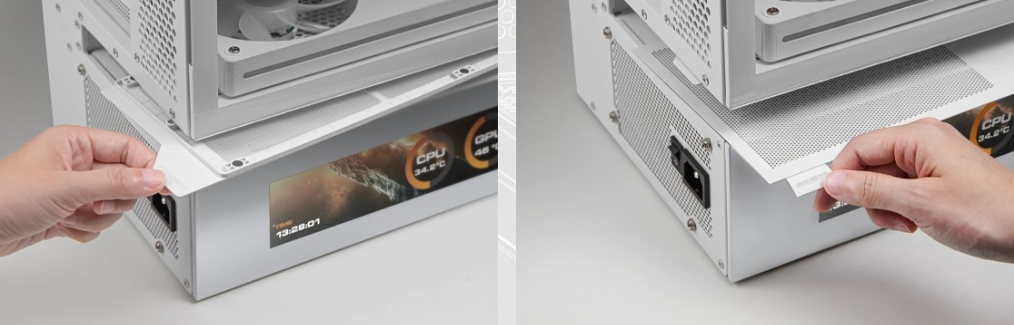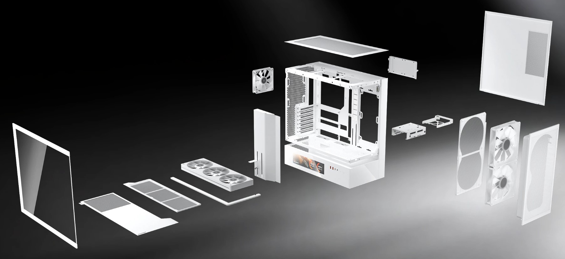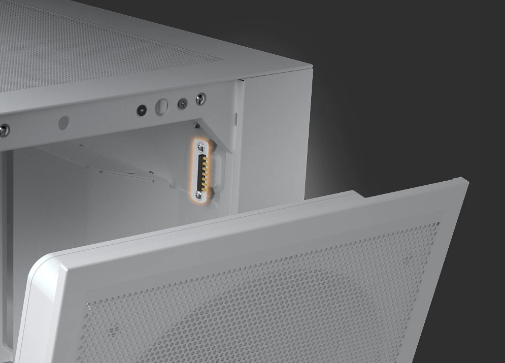 Модуль передньої панелі "3-в-1" — що об'єднує пиловий фільтр, два попередньо встановлених 160-міліметрових вентилятори ARGB PWM і сітчасту панель в один попередньо зібраний блок — дозволяє виконувати технічне обслуговування одним простим кроком. Пиловий фільтр магнітно кріпиться до рами, два 160-мм вентилятори ARGB PWM (попередньо встановлені) встановлюються в раму, попередньо прикріплену до передньої сітчастої панелі, передня сітчаста панель і попередньо прикріплена рама утворюють єдиний закінчений компонент.