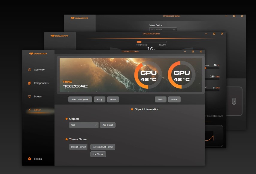 Монітор CFV235 Mesh Vision оснащений 9.16-дюймовим LCD-дисплеєм IPS TFT з роздільною здатністю 1920 x 462 і частотою оновлення 60 Гц для моніторингу системи в режимі реального часу. Відстежуйте критично важливі дані, від температури до швидкості обертання вентиляторів, і персоналізуйте дисплей, використовуючи контент у форматах JPG, PNG, GIF або MP4 . Управління здійснюється за допомогою програмного забезпечення, яке виконує функцію оперативного центру управління.