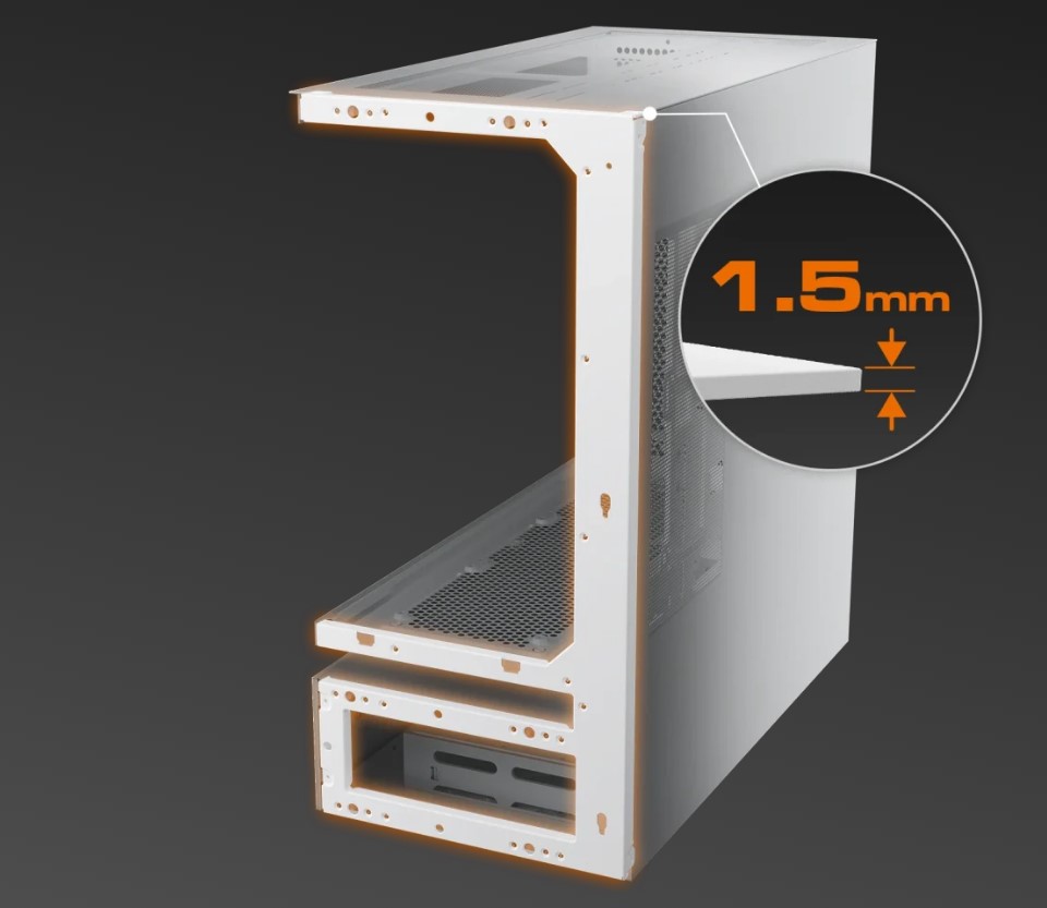 Сталева рама товщиною 1.5 мм підсилює шасі, зберігаючи структурну цілісність навіть при використанні підвісної центральної вентиляції. В результаті виходить смілива, відкрита архітектура, яка залишається жорсткою, надійною і готовою до високопродуктивних збірок.