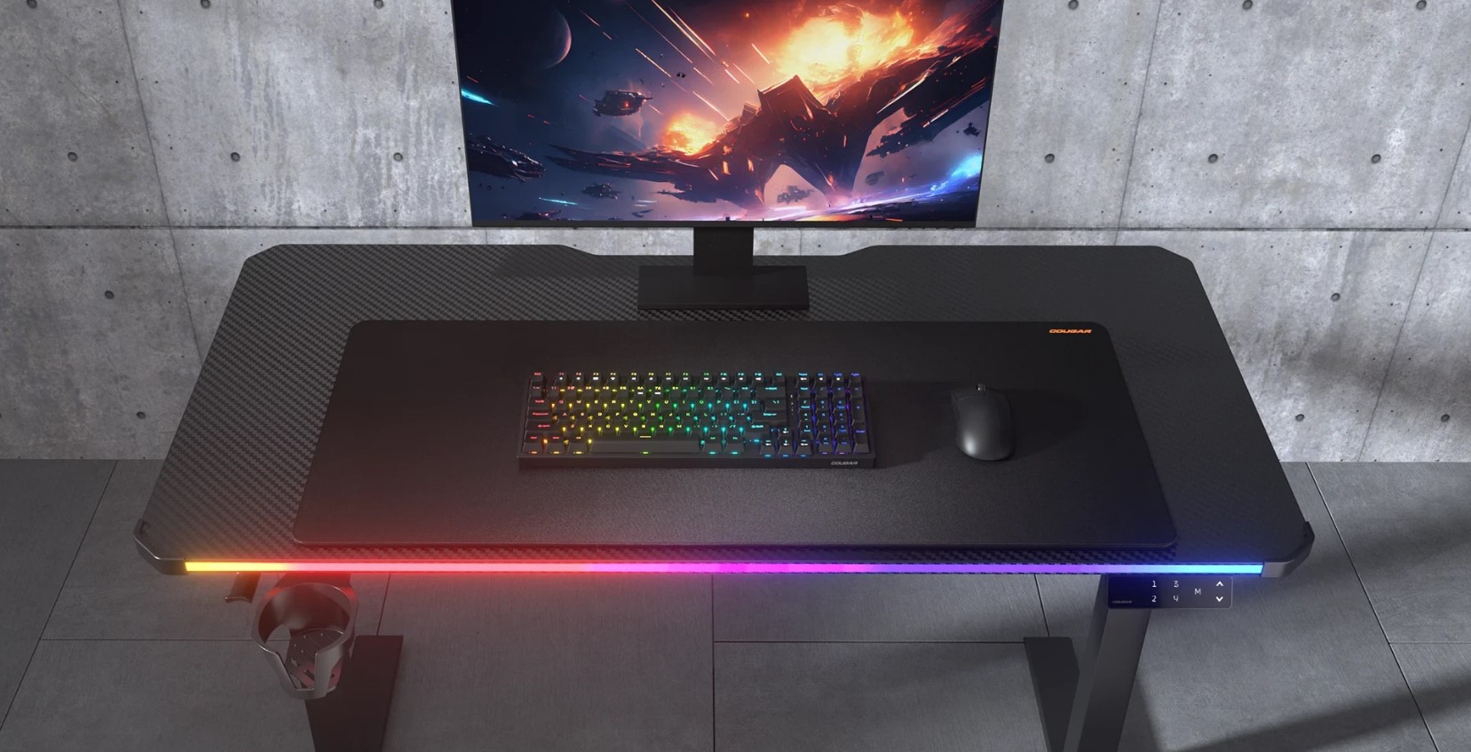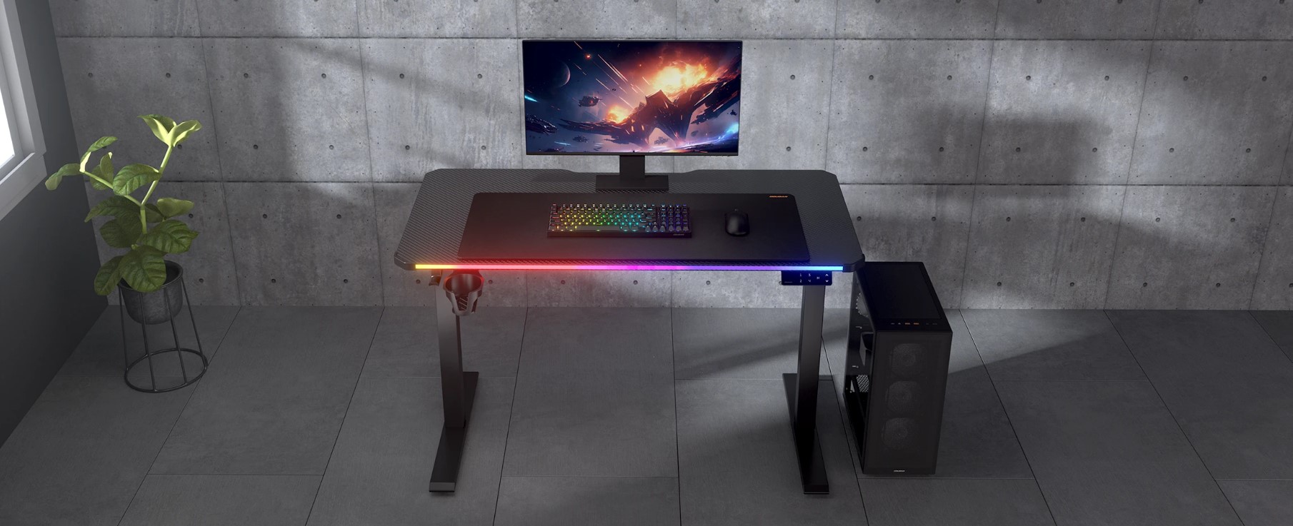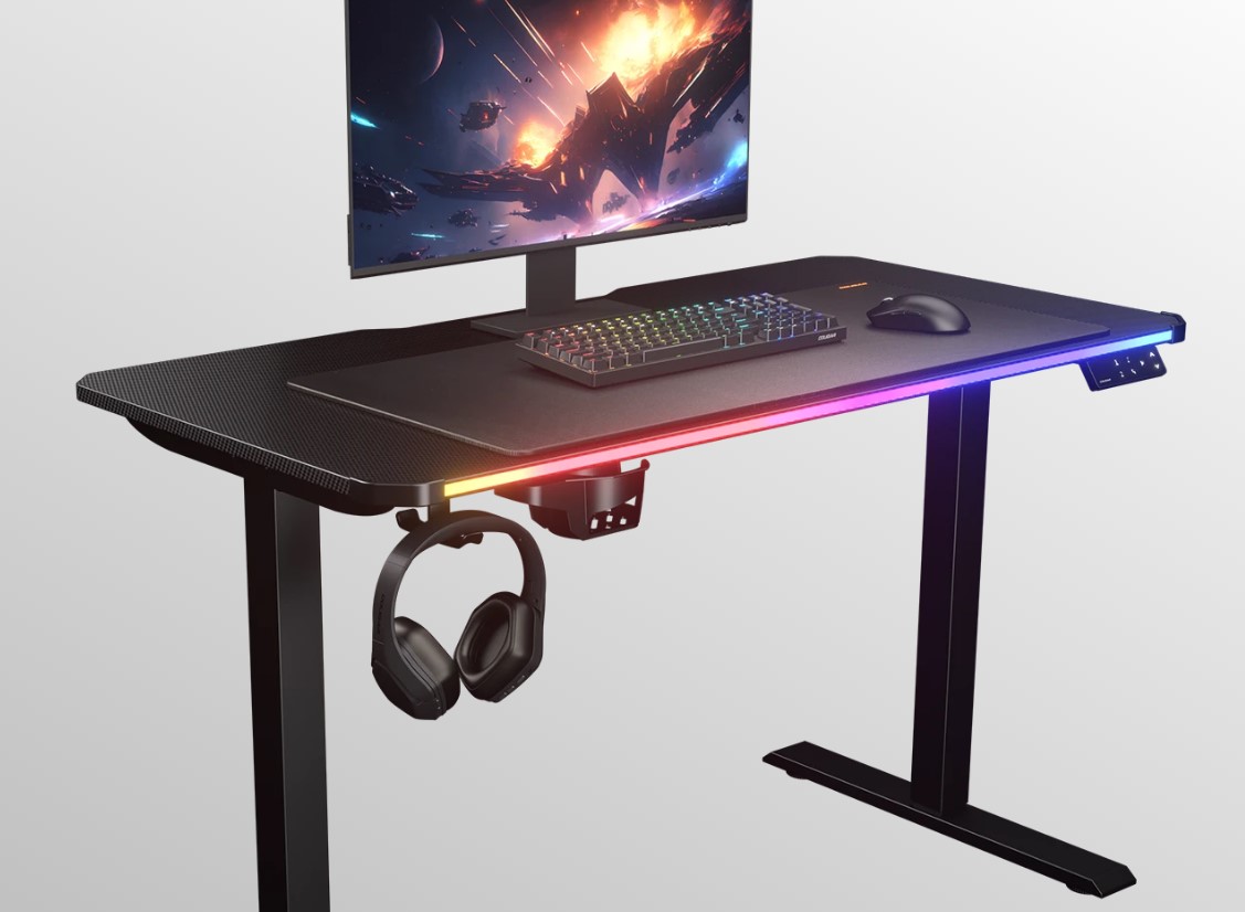 Ігровий електричний стіл E-Ares 120 поєднує в собі компактність і довговічність, а також функціональність RGB-підсвічування в компактному розмірі 120 х 60 см. Він об'єднує безпечне регулювання висоти з такими зручними функціями, як поворотний підсклянник і зарядний порт USB-C.