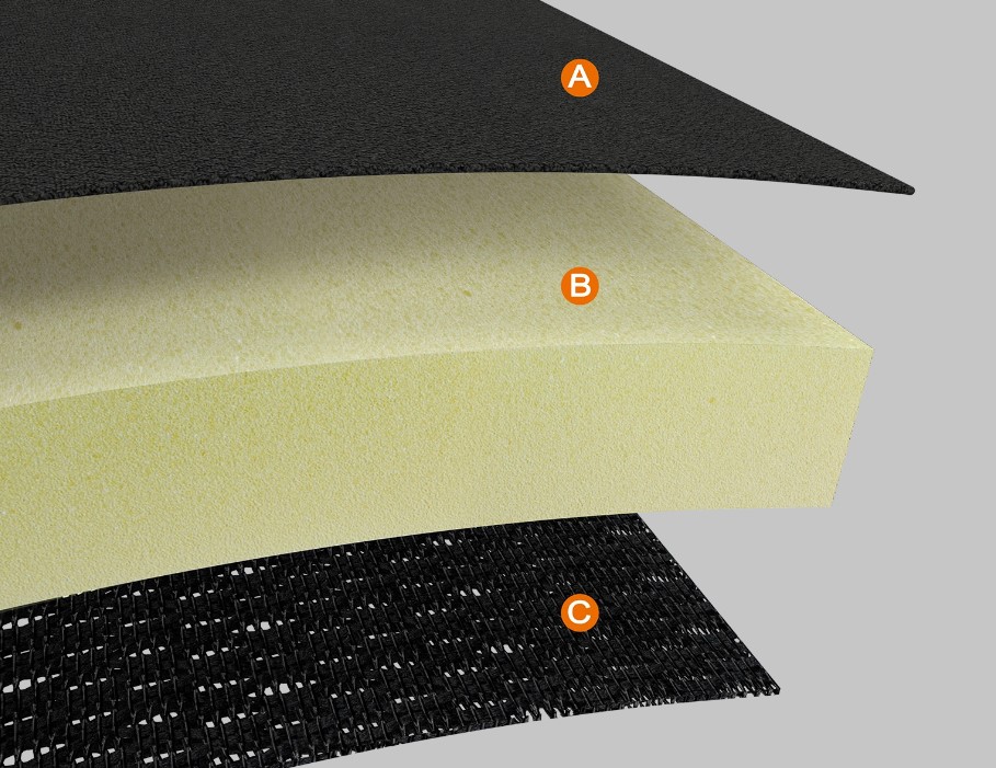 - А. Верхній шар — еластична трикотажна тканина AquaShieldTex. Приємна на дотик, м'яка, зносостійка, легко миється і довговічна