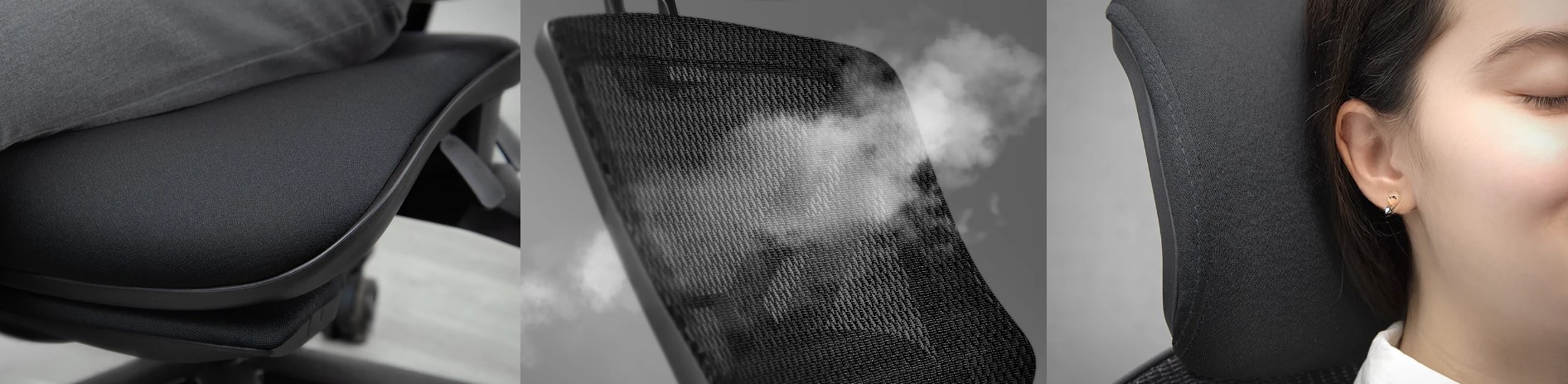 Спинка має вигнуту форму, що повторює природні контури талії, що забезпечує додаткову підтримку і комфорт для попереку. Сидіння з нахилом вниз зменшує напругу і тертя на задній поверхні стегон: ця особливість знижує тиск на коліна і покращує кровообіг в нижніх кінцівках, сприяючи рівномірному розподілу ваги по сидінню завдяки його контурній конструкції.